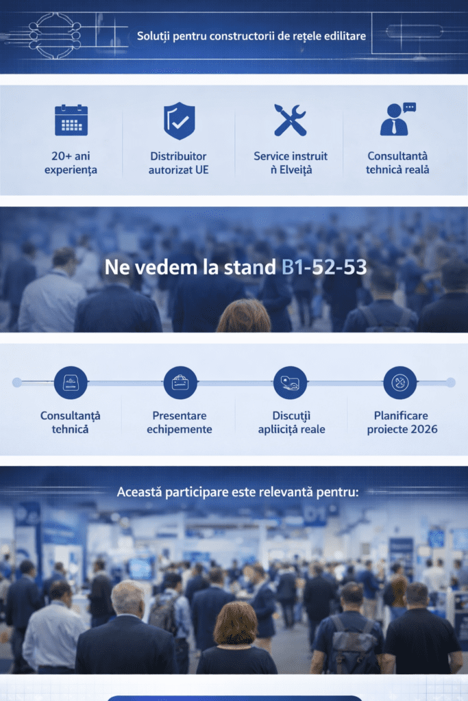 Participarea noastră este orientată către prezentarea echipamentelor și tehnologiilor utilizate în lucrări de infrastructură modernă, cu accent pe eficiență operațională, siguranță și soluții adaptate cerințelor actuale din șantier.